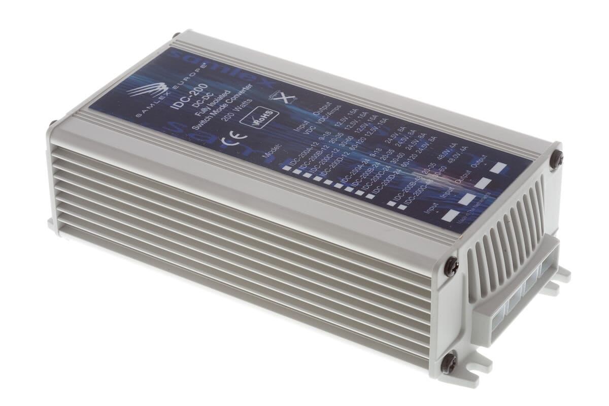 IDC-200-serien er en komplett serie med svært effektive 200 Watt isolerte DC-DC-omformere egnet for applikasjoner som krever galvanisk isolasjon mellom inngang og utgang. Den isolerte DC-DC-konverteren IDC-200B-19 gir en svært regulert utgangsspenning på 19 Volt for et inngangspenningsområde på 20-35 volt og en nominell utgangsstrøm på 16 ampere (ved 35 volt inngang). Egenskaper i denne isolerte DC-DC-omformeren inkluderer kompakte hus, tilbakeslagsbegrensning og beskyttelse mot kortslutning, overoppheting, overspenning og reverspolaritetsforbindelser. Enheten leveres med 6,3 mm trykk på flatblader "hurtigkoblings" -kontakter. Den isolerte DC-DC-konverteren IDC-200B-19 er EMI / EMC-kompatibel og samsvarer med de europeiske standardene EN50081-1 (for EMI), EN50082-1 ??(for EMC) og det europeiske kjøretøydirektivet 95/54